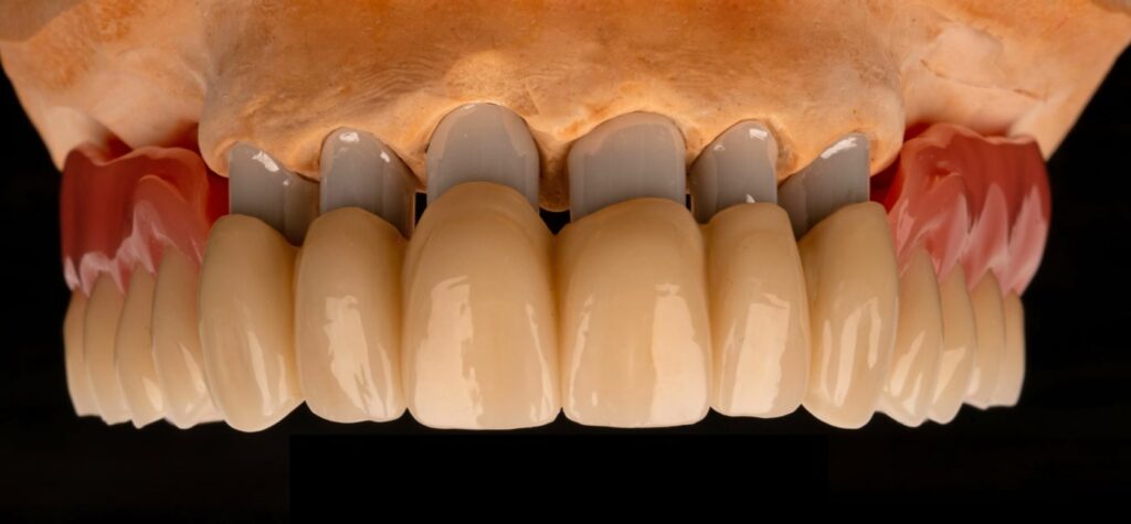 Unsere Teleskopkronen können aus Gold oder eine Nicht-Edelmetall-Legierung hergestellt werden und mit einem biokompatiblem Kunststoff-Keramikgemisch verblendet.